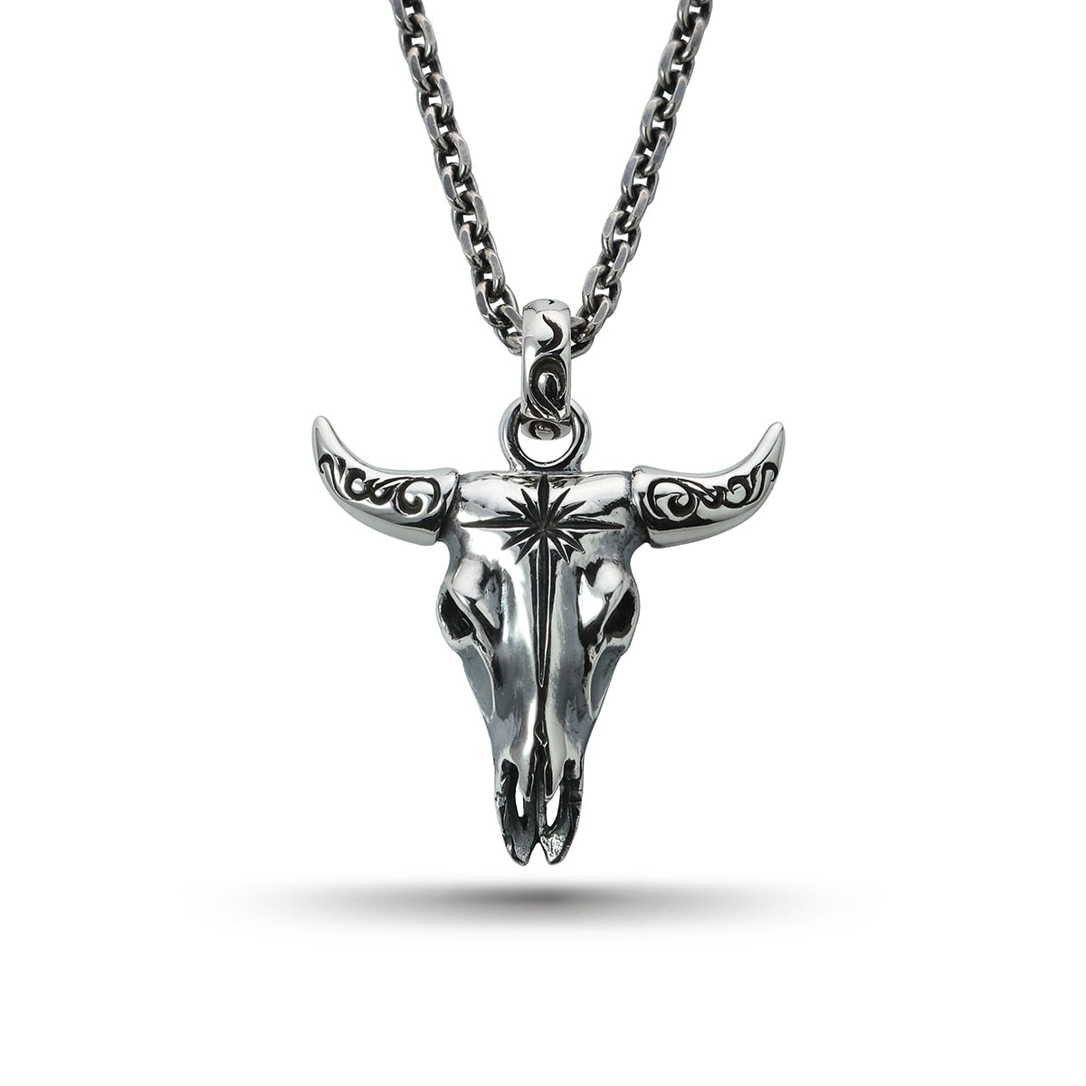 This buffalo skull pendant features intricate detailing, with a sun symbol on the skull and engraved horns. The buffalo, a symbol of strength and protection in Native American culture, adds meaningful depth to the design. Perfect for those who appreciate powerful symbolism and unique craftsmanship, this pendant is a statement piece.