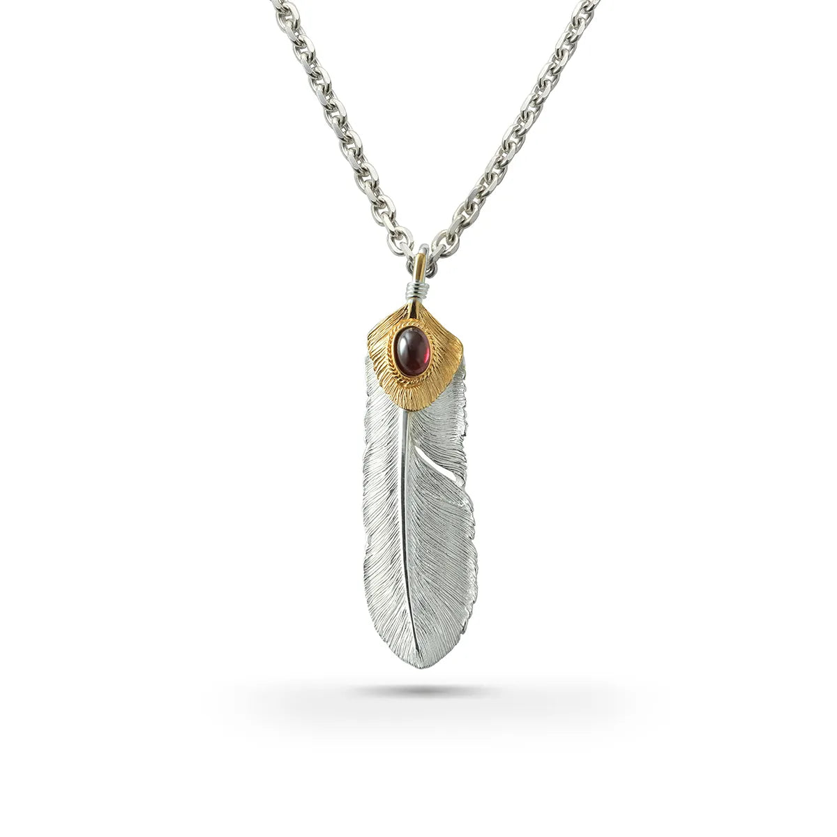 This left-facing feather pendant features an oval garnet stone set within a 24K gold–plated “Heart” motif, inspired by the soft feathers that protect a bald eagle’s heart. Each feather line is carefully curved to create a lifelike silhouette in natural silver color.