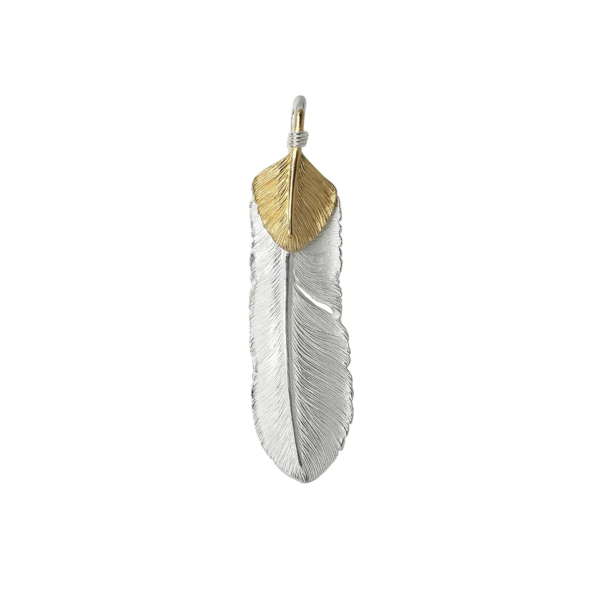 The delicate feather texture is finely expressed, while the combination of silver and gold plating creates a striking two-tone contrast.